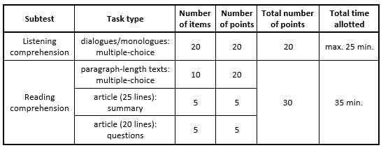 The format of the entrance test includes two subtests of two language skills – listening comprehension and reading comprehension. The listening subtest consists of 20 multiple-choice items in the form of monologues or dialogues from everyday life with a total maximum length of 25 minutes. Each recording is repeated and the max. number of points awarded for this subtest is 20. The reading subtest also consists of 20 items, but the items are of three different types to cover the reading skills more thoroughly. The first subpart includes 10 multiple-choice items with paragraph-length texts dealing with everyday topics. Each of these items is awarded two points because this activity involves reading in detail. The second subpart is represented by an article which is approximately 25 lines and its summary is a five-line text where there are five gaps, each for filling in one word logically completing the summary. The max. number of points awarded for the summary is 5. The third subpart contains another article with five open-ended questions that should be answered with the max. of four words. Altogether, these questions are awarded the max. number of 5 points. The articles in the last two subparts typically deal with rather technical or specialized topics that might be of interest to the target group of UoD students. The max. number of points awarded for the reading subtest is 30. The format of the entrance test is summarized in Figure 1.