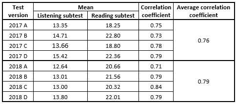 To justify discarding the subtest of listening comprehension from the entrance test and thus making it more practical, the authors of the paper needed to analyse the correlation between the two subtests of each test version and to submit the obtained correlation coefficients to the appropriate test of significance. The results of the correlation analysis are provided in the following Figure 5.