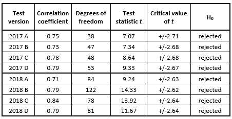 The stricter significance level α = 0.01 was chosen on purpose to increase the certainty with which the final results of the analysis could be treated. From Figure 6 it is obvious that even for this significance level the test statistic t was always safely away from the critical range of t values and, consequently, H0 could be rejected for all the test versions with the conclusion that all the correlation coefficients being tested are significantly away from zero, proving a strong and statistically significant relationship between the two subtests of all the test versions.