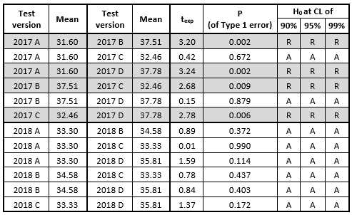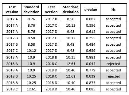 It can be seen that for most of the test versions the p-values exceeded the significance level α = 0.05, which means that the difference between the standard deviations of the pairs of tests is not big enough to be statistically significant and, consequently, the null hypothesis (H0) can be accepted. Only in two cases, when the test versions 2018 A and 2018 C, and the test versions 2018 B and 2018 C were compared, the difference between their standard deviations was statistically significant, but after applying the significance level α = 0.01, even in these cases the p-values exceeded the significance level. Thus, the final conclusion that can be made is that variances in all the test versions are the same which proves that all the test score samples were obtained from the same population. Consequently, this fact justifies the application of the Student’s t-test to examine whether the means of the test versions are statistically also the same.
