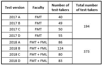 In order to analyse whether the parallel forms of the English entrance test at the UoD can really be considered “parallel” and whether the subtest of listening comprehension can be justifiably discarded from the entrance test, the authors of the paper analysed the scores of all the test-takers that were available. Altogether, they managed to obtain the test results for the years 2017 and 2018. For the year 2017, the results were available only for one faculty (the FMT) and for the year 2018, the results for both faculties were available (the FMT and the FML). For both years, four alternative tests were developed (test versions A, B, C and D), each test consisting of the listening comprehension subtest and the reading comprehension subtest. Due to time and human resources constraints, only about two thirds of all the items for the particular test were produced completely new and one third of the items were recycled from the previous years. Some extent of continuity was achieved in this way. All newly developed items were pretested on a group of individuals, ideally having personal characteristics and language proficiency similar to the target group of test-takers (i.e. approximately level B1 according to CEFR). The results of this pretesting phase were analysed and statistical characteristics of the items were determined. Based on these parameters, like the item facility value (i.e. item difficulty) or the item discrimination index (i.e. the item’s ability to differentiate between high and low scoring test-takers), the items were combined in a way to even out any differences in these parameters with the effort to compile test versions ideally showing similar statistical characteristics. The numbers of test-takers whose scores were analysed for each individual test version are shown in the following Figure 2.