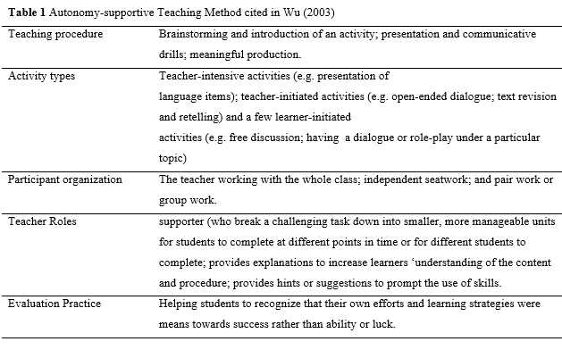To determine the impacts of autonomy-supportive teaching style, as described in self-determination theory, on psychological need satisfaction as well as autonomous/ intrinsic motivation in learners, the subjects benefitted from an instructional intervention, including 16 weekly sessions. To manipulate the teaching style to create an autonomy-supportive environment, the researchers applied Wu’s (2003) autonomy-supportive teaching method, which is based on Black and Deci’s (2000) autonomy-supportive framework within SDT. Table 1 shows the teaching method applied to the participants assigned to SDT-focused intervention program.