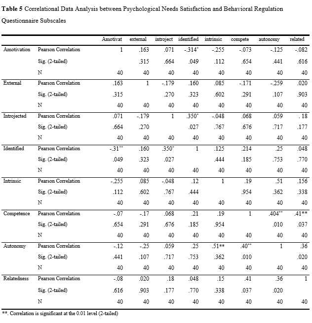 Also, Psychological Needs satisfaction questionnaire was administered among the subjects two times, prior to and after the completion of the instructional intervention. Then, paired t-test was run between the subscales of Psychological Needs Satisfaction questionnaire. Moreover, to investigate the correlation among autonomy, competence, and relatedness as well as more autonomous/self-determined (intrinsic and identified) motivational regulations, correlational data analysis was computed among Psychological Needs Satisfaction and Behavioral Regulation Questionnaire subscales after the completion of the instruction.