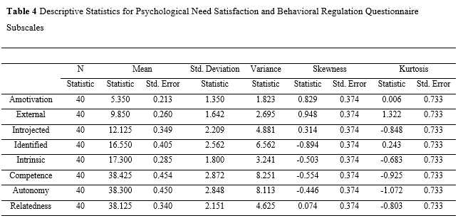 In addition, correlational data analysis was computed among Psychological Need Satisfaction and Behavioral Regulation Questionnaire subscales after the completion of the instruction to investigate the relationship among autonomy, competence, and relatedness as well as more autonomous/self-determined (intrinsic and identified) motivational regulations. Table 4 reports the descriptive statistics.