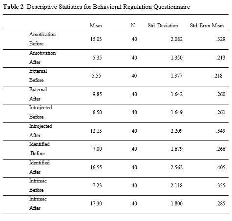 As it was stated earlier, paired t-test data analysis was run between the data collected from the Behavioral Regulation Questionnaire. The results of descriptive statistics are reported in Table 2.