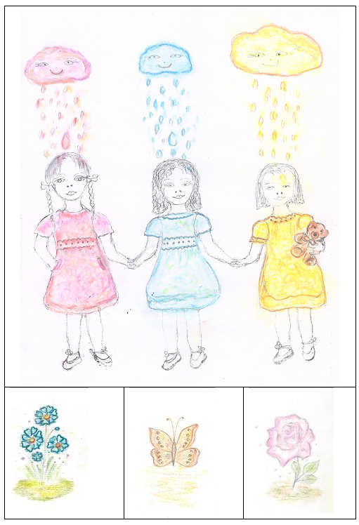After the feast the three sisters went home. They wanted to keep their promise to go straight home. BUT on their way home some strange things, some wonders, happened! In a moment the sky got darker, a storm started. Then the storm ended. The sun smiled again. The three sisters looked at the sky and they saw three colourful clouds floating in the sky: a pink one, a blue one and a yellow one. While they were enjoying the sight of these three clouds, it started raining. It was not an ordinary rain. It was colourful rain! This colourful rain painted their white dresses in pink, blue and yellow.