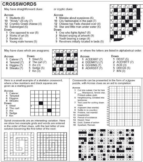 Clues for crosswords are variable ranging from straightforward clues, cryptic clues to clues which the letters are listed in alphabetical order. Furthermore, crosswords may be in the form of skeleton puzzles, jigsaw puzzles, or spiral crosswords.
