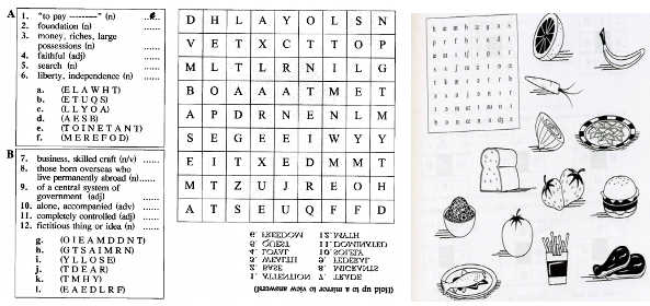 A word search puzzle is a word game that consists of the letters of words placed in a grid, which usually has a rectangular or square shape. The objective of this puzzle is to find and mark all the words hidden inside the box. The words may be placed horizontally, vertically, or diagonally. Often a list of the hidden words is provided, but more challenging puzzles may let the player figure them out. There are some interesting variations for word search puzzles. It may include definitions and its relevant words which the letters are listed in the wrong order; then learners have to do the matching task first and locate the words in the word search grid. The interesting thing is that they will hold the grid up to a mirror to see the answer. Another option for word search puzzles is given picture clues and student will circle the word. More challenging, learners are asked to circle the words without any clues but a given theme, i.e. “jobs”, “nature” and so on.