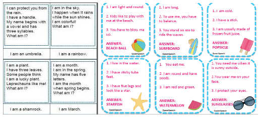 Riddles show up the playful nature of language in an easily manageable form. Riddles can be difficult or simple depending on learners’ levels and interests. Teachers can first play with the whole class and then try in groups (good for mixed ability groups).