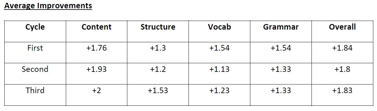 On average, the students improved their ability to fulfil all the criteria expected of them in academic writing at this level, and the most significant improvements were in content. Meaning their ability to take ideas from a prescribed text, and transform these ideas to use as evidence to answer an essay question in their own voice.