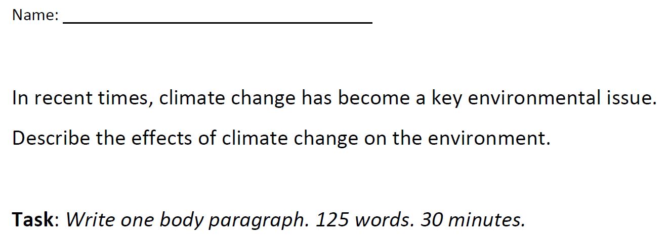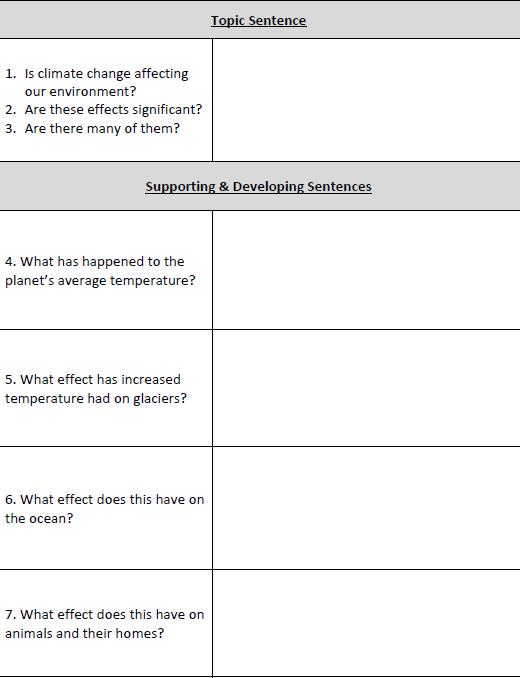 The first stage is designed to assist students with the first step of process writing: planning and outlining. Provide students with a detailed outline for the essay, which breaks down the essay question into smaller parts using simple questions (appendix D). Over the course of the term, teacher scaffolding of this outline is gradually reduced until they can come up with their own questions. Put students in groups of four. Each student is given an individual paragraph from the reading article, which can be used to answer a specific question from the outline. So, in our sample (appendix D), the first student’s paragraph would relate to global temperature change, the second melting glaciers, the third sea level rise, and the last habitat destruction. Students are given 5 minutes to read their paragraph which is then removed. As a group, they have to ask a question to the student on their right. The student then answers the question, orally, without the text in front of them, and the person who asked the question writes down their answer. Students continue this process for each member of the group. They do not have to write down coherent sentences, just the main points. This stage really helps students improve their ability to transform ideas, using their own voice.