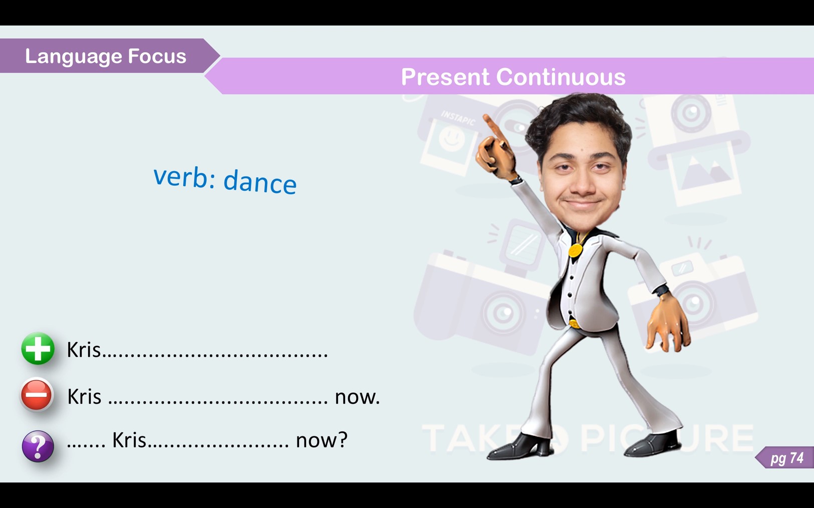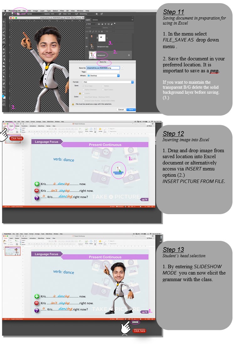 My instinctive approach was to teach this “how” through a method of personalised visual learning which would allow each student to “see” him or herself using the language in an everyday context. To achieve this goal, I decided to incorporate images of the students into my lessons - specifically their heads!, in quirky vignettes to elicit grammar or to reinforce or prompt a grammar concept, I was telling grammar’s story. Immediately they were engaged in this interactive activity.