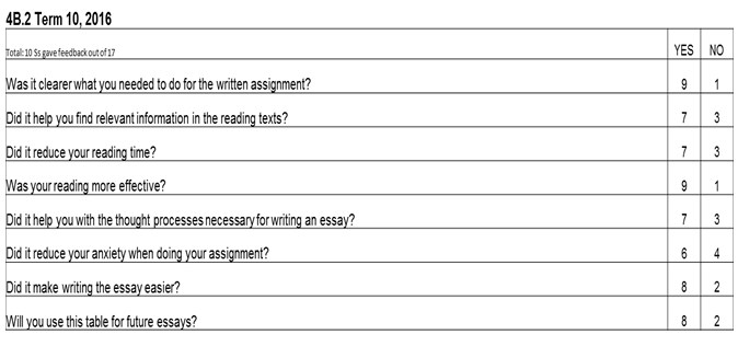 Throughout the course, the teacher noted an increase in critical thinking made evident from task responses and student questions. Motivation increased as predicted by Sigel (1984, cited in Beyer, 1997, p.266) as students perceived the skills necessary at the time when such skills were required of them. Students adhered to the drafting process in a timely manner and demonstrated increased autonomy. In addition, attention could be drawn to poor study skills, for example, note-taking, which became increasingly more relevant to students’ needs. Most interestingly to note was the fact that the final essays showed greater variety of content and moved away from formulaic responses. Overall, it appeared that students had greater grasped the purpose of academic writing and its features.