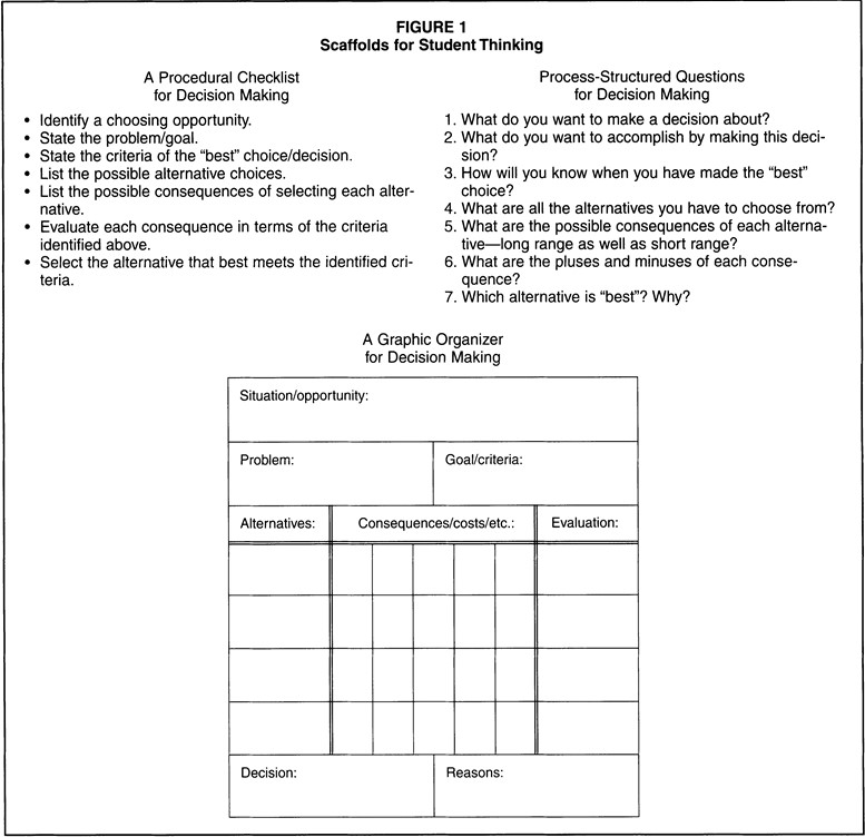 By continuously and explicitly engaging students in the cognitive skills required in academia through activities that encourage metacognitive reflection, research has demonstrated that students obtain higher grades in their subject matter as a result of their improved thinking skills (Estes 1972 cited in Beyer, 1997, p.267). However, students need to be conscious of the thinking skills employed and be able to compare them to those of the ‘expert’. McTighe and Lyman (1988 cited in Beyer, 1997, p.265) recommend the use of graphic organizers to both present and activate the steps in a specific thinking operation (See: Figure 1 below).