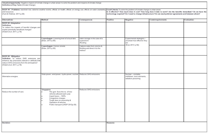 A comprehensive modular example which included a graphic organizer was used to make visible the underlying cognitive strategies and sociocultural/psychological beliefs on a recent academic English course. The main aim of the course was to teach students how to write a problem-solution essay on the topic of environmental problems based on a number of articles read. The graphic organizer asked students to name and describe the problems along with their impacts. Students then had to name potential strategies, how they would be implemented, the necessary costs and requirements as well as their expected impacts. Finally, students were required to establish criteria in order to evaluate the best possible solution before making their decision. Below is an example of work completed in class.