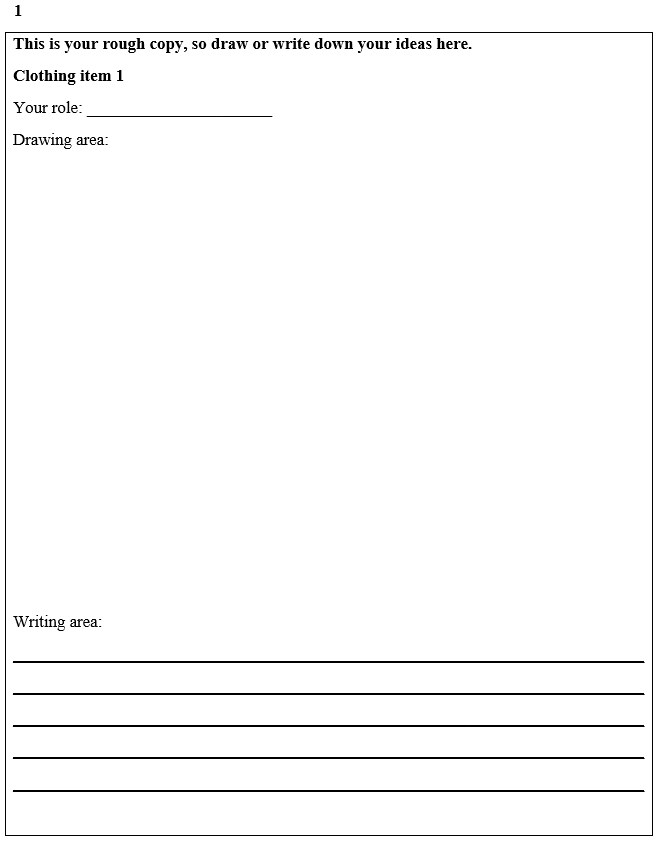 The pupils get four minutes to create each clothing item. After each four minutes the representatives come together for a meeting. They present the idea of the first clothing item and they check each other’s texts for mistakes. While the representatives meet up, the other pupils work on the next clothing item. The third clothing item will not be discussed by the representatives, so that item will be the secret item.