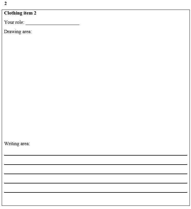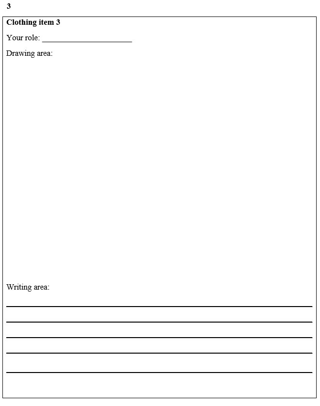 For this exercise the pupils are divided into groups of four. In each group one person is the fashion designer, one is the reporter, one is the graphic designer and one is the representative. After working on each clothing item, the pupils are allowed to switch roles.
