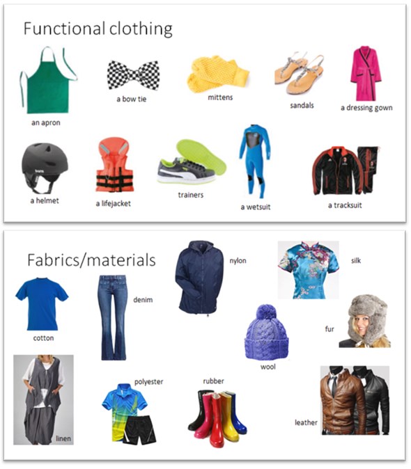 | an apron a bow tie mittens a pair of sandals a dressing gown a helmet a lifejacket a pair of trainers a wetsuit a tracksuit | cotton denim nylon silk linen polyester rubber wool fur leather | long-sleeved checked sleeveless floral short-sleeved striped plain sporty fashionable |