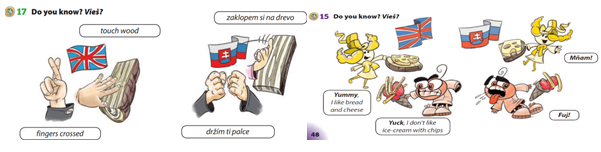 From the non-verbal competence, e.g. gestures for good luck can be taught. Children can be taught that the Slovak ‘holding thumbs’ is ‘crossed fingers’ in English, that gestures are not universal and have different meanings in different cultures. Onomatopoeia, extra-linguistic speech sounds expressing likeness, disgust, disapproval are often considered as universal, however they are culturally bound. Extra-linguistic speech sounds for liking food and drink is ‘yummy’ (mňam) and for disgust of food and drink is ‘yuck’ (fuj). Some more examples are exclamations for silence ‘shush’ (pst), attracting somebody’s attention ‘oi’ (hej), onomatopoeia for animal sounds of dogs ‘woof’ (hav), or frogs ‘croak’ (kvak).