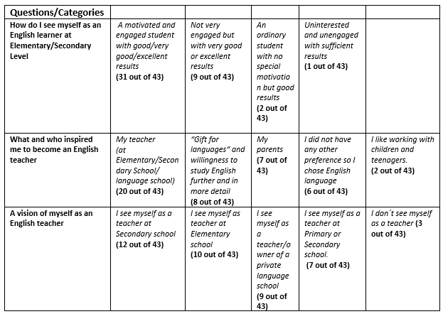As is evident from table 1 above, students´ answers were collected from their essays and arranged in the order according to their most frequent answers. The most interesting finding was to see the connections among the answers of a particular person. For example, the person who defined himself during his school days as an uninterested student with only sufficient results, was inspired by his English teacher at secondary school to become a teacher of English and eventually enrolled on the teaching programme at our faculty.