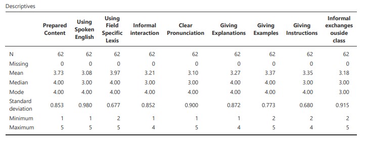 This division was reflected in those who attended the course and the numbers were fairly evenly matched between those teaching the natural sciences, medicine and IT when compared with Human Sciences. The results of the initial questionnaire can be seen in Table 1., together with the focus of each of the questions asked, where 1= strongly disagree and 5= strongly agree. The statistics show that the lecturers on this course were generally quite confident about their linguistic confidence but the areas which they considered to be somewhat problematic were: using spoken English, pronunciation and informal interactions, which are all related. It later emerged in the mentoring sessions, however, that some of the questions had not been completely understood, in particular ‘giving instructions’ which referred to issues of classroom management that were not clear to lecturers who generally favour a more traditional lecturing style of delivery. None of these results were surprising but formed a basis for later discussion.