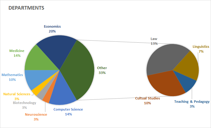 The questionnaires, which were administered prior to the beginning of the course focused mainly on establishing lecturer beliefs about their own abilities and the results were not surprising as most lecturers were confident in their English language competence when given time to prepare or rehearse lecture content but were less sure of their ability to produce effective spontaneous spoken language. The initial focus for most lecturers was clearly placed on their English language proficiency, however, which reflects findings from the literature (Macaro et al., 2018: 52) where lecturers are seen to focus on both lecturer and learner language proficiency model of EMI. The initial questionnaire was available to all the university staff and 62 answers were received and analysed from lecturers working in a range of different departments as reflected in figure 1 below.