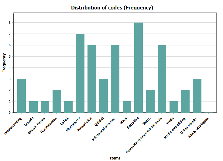 Padlet was another tool which proved popular as learners can create content in a range of ways, comment on each other’s ideas asynchronously, rather than synchronously in class, which is the case with Mentimeter. Padlet, although it was not perhaps as popular as other tools, also enables audio files to be recorded so that students can speak as well as write. Quizlet, which provides a range of activities with digital flashcards, is another tool which was popular with some lecturers, particularly in subjects such as anatomy or geography where it was perceived to be a useful aid for memory work.