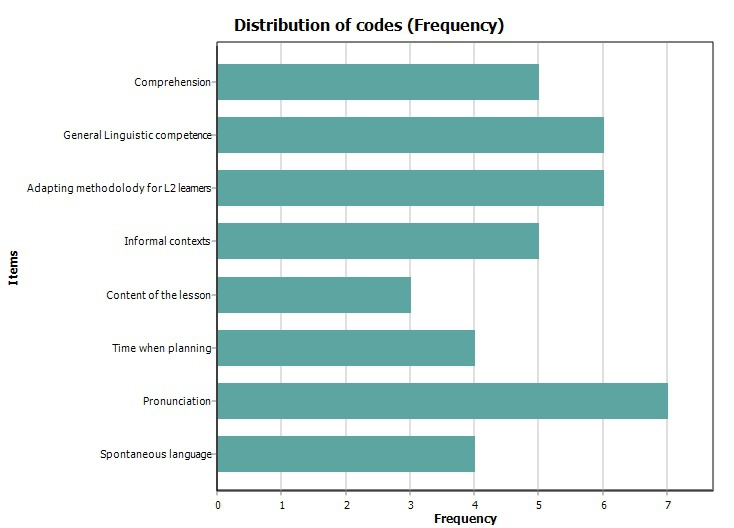 The bar chart below (fig. 2) displays frequency codes over a minimum of 2 cases (where each mentee is one single case) presenting an outline of the key areas of interest to the mentees. As can be seen, pronunciation was a key concern for seven mentees followed by general language competence and adapting materials for L2 learners for six mentees and then use of language in informal contexts and comprehension. Spontaneous language production and lesson content scored lower but were still areas that reflected lecturers’ concerns.