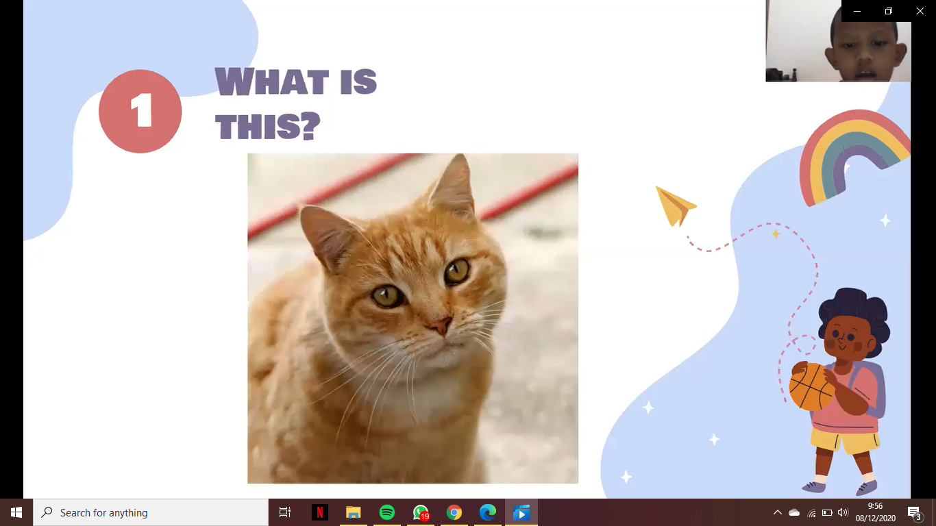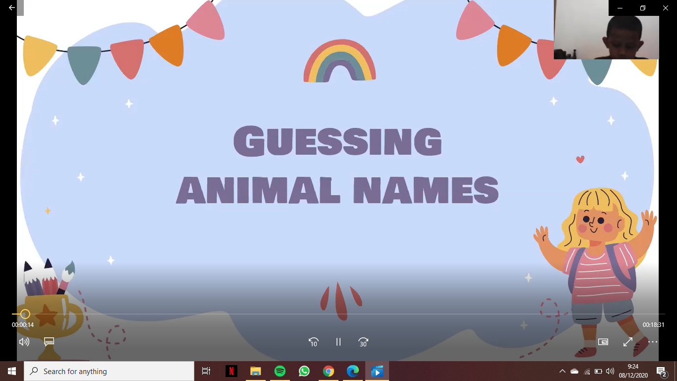 On the second day, starts by opening ZOOM again then placing the PPT material I gave for Eden in it. First, I was a little tough, but because the PPT I made was pretty interesting. Finally, Eden became able to see more, as a media position instructor for young learners is a very significant point in teaching because during the process of learning time in addition to teachers, so not exhausted learners often do not feel bored. as cited by Meyer, Rose, & Gordan( 2014) A structure for maximizing teaching for all learners should be provided by teachers. I began teaching spelling on the title mentioned after that activity, steadily following Eden's spelling of me as the teacher, Lessons continue until the word mentioning the names of animals one by one which was previously studied. Eden is familiar with the lessons I taught the day before and he even said it right, although it still needs guidance. Like the image that I pinned below: