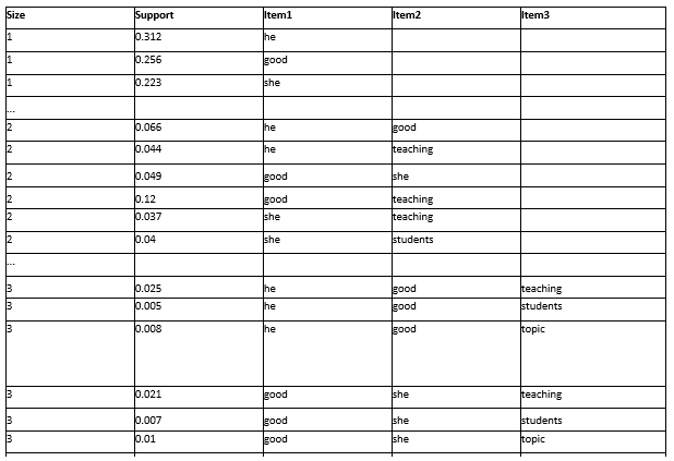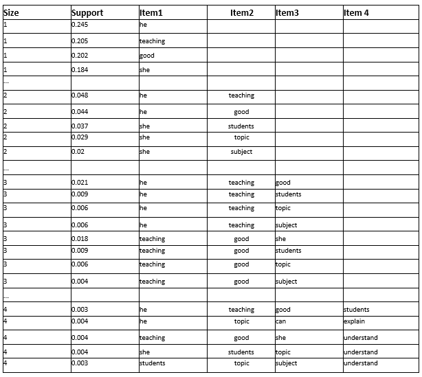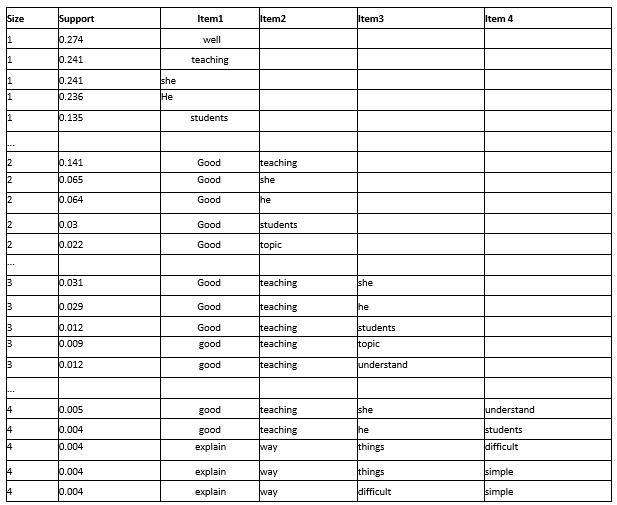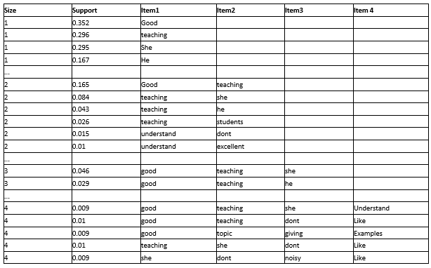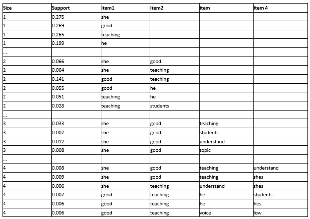 The most frequent itemsets occurred are the following: itemset good and teaching for size 2 with a support equal to 0.141; itemset good, teaching, and she for size 3 with a support equal to 0.031; and itemset good, teaching, she, and understand for size 4 with support equal to 0.005. For example, the terms good and teaching are the most common terms used in the comments on the performance of the faculty members, that is, this itemset occurs 1,410 times for every 10,000 comments. Another, the itemset containing terms explain, way, things, and difficult means that it occurs 40 times for every 10,000 comments. The results in this section is useful in considering the rules that are worthy for further analysis. The FP -Growth results per campus are provided below:
