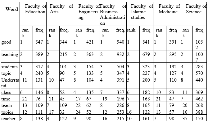 It can be reflected that the term good is still the top one terms occurred for all campuses. The Faculty of Education Campus almost reflected the actual rankings for the overall data set except for the term topics. The Table 4.2 gives us the idea on the terms mostly used by the students per campus when giving comments on the performance of the faculty members. Say for example, the term teacher under the Faculty of Science Campus is ranked number three, which has a relatively higher rank compared to the other remaining campuses, tells us that most of the students on this campus gives greater importance on the usage of this term.