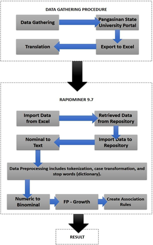 The figure above shows the process that was employed from data gathering up until the use of RapidMiner to arrive at the desired results.