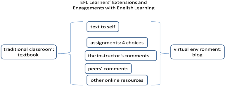 From the perspective of language teachers, this empirical study presents a framework for the integration of blog assignments to extend EFL freshmen’s engagement with English. The findings of this study have provided language teachers with a framework for the design and implementation of courses with the integration of blogs and tasks. From a research perspective, drawing on previous empirical research on blogs at tertiary levels (Fageech, 2011; Kim, 2008; Mitchell, 2011; Xu, 2011; Zarei & Al-Shboul, 2013), multiple sources of data and rich and thick descriptions were adopted to contextualize the study on blog assignments to extend EFL learners’ engagement with English.