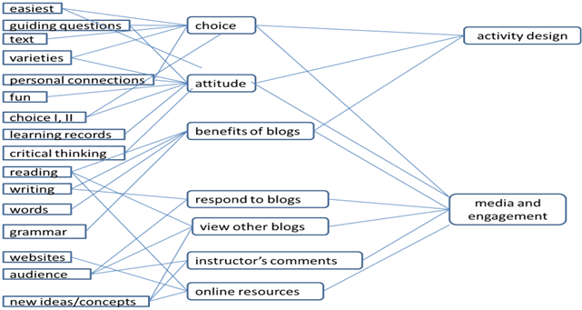 All names in this study were pseudonyms. I transcribed the participants’ blog posts, their responses to the class evaluation, and the PowerPoint slides into raw field notes. The data was coded in the following three stages. First, I read through all the notes and coded the data (e.g. guiding questions, varieties, audience, etc.). Second, while reading through these codes, I labeled tentative categories (e.g. attitude, choices, learning, benefits, etc.). Finally, the researcher sorted the data based on its relevance to topics that reflected the research questions, as depicted in Figure 2. The researcher then constructed a set of codes for thematic analysis that captured the meanings expressed by the data (Flick, 1998).